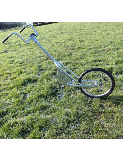 Tout d'abord, une roue (gonflable à rayons de 51 cm) assez grande pour un bon développement, mais pas trop pour pouvoir manœuvrer facilement , ensuite un système permettant à la fois de fixer l'outil, de régler l'angle et la hauteur pour l'utilisateur. Enfin, nous avons recherché à équilibrer à la fois la force d'appui sur l'outil et celui sur la roue. N'oublions pas l'ergonomie du manche qui permet de tenir fermement et confortablement la houe et la système de décalage sur le manche facilitant le travail le long des murs.